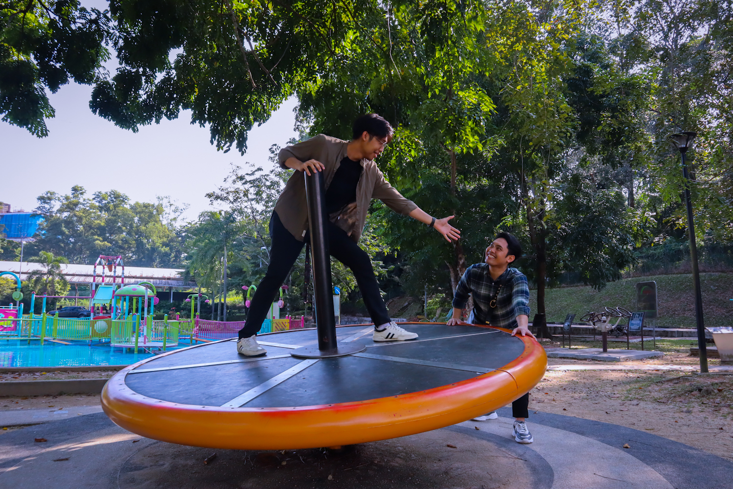 Taman permainan fizik untuk anda semua! Rasai pergerakan harmoni pada buaian berpasangan, cabar daya emparan di atas gasing gergasi serta daki struktur Max Climber hingga ke puncak.